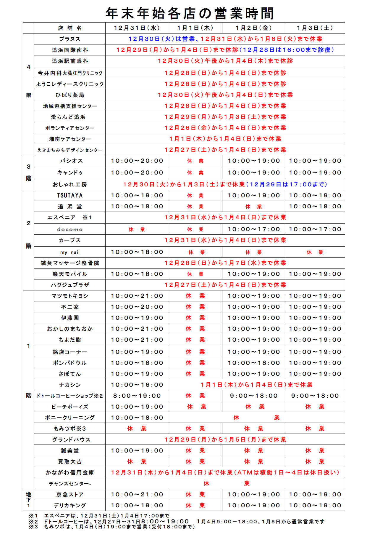 年末年始営業時間のお知らせ全館営業時間